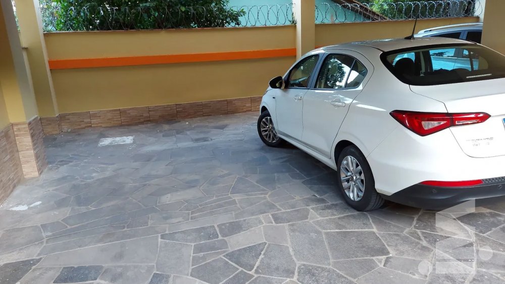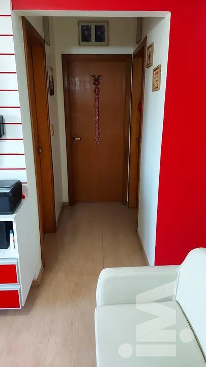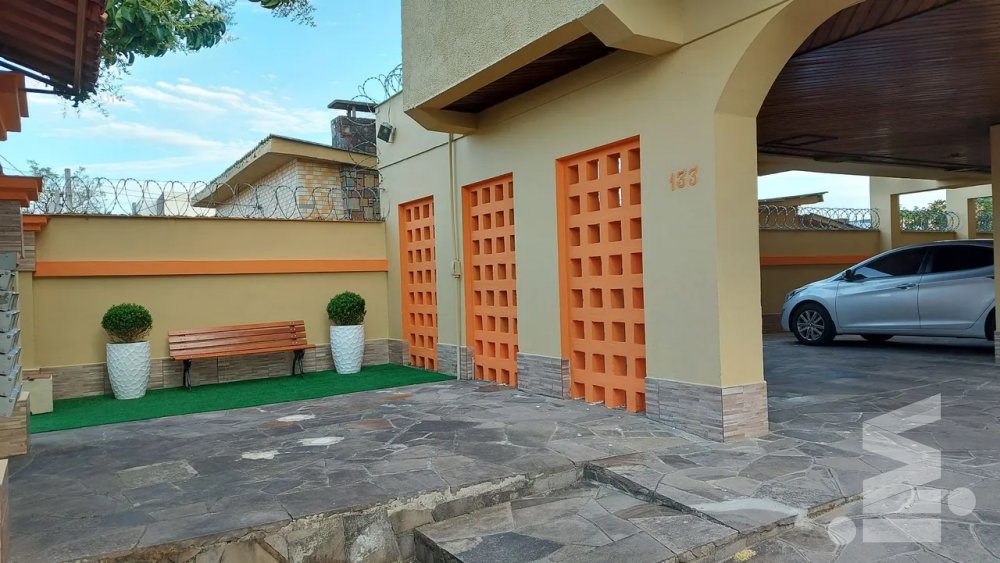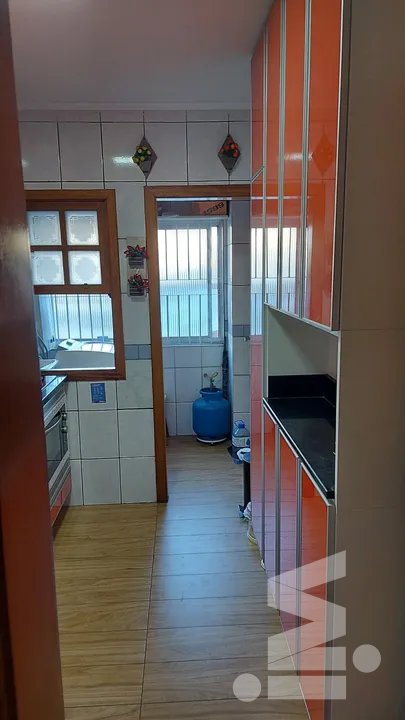 Apartamento de dois dormitórios, com sala, varanda, cozinha, área de serviço, banheiro social e uma vaga de garagem coberta.
