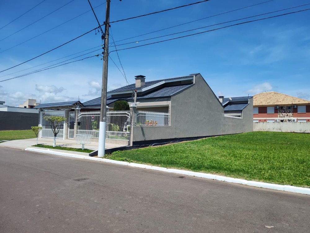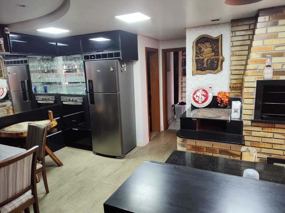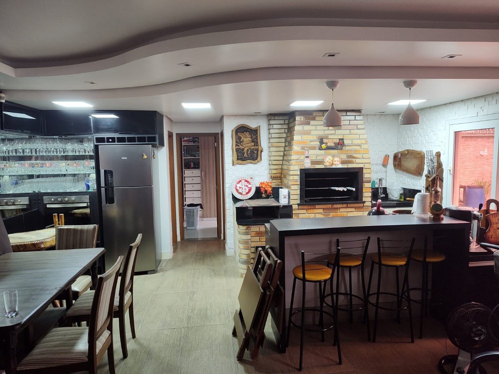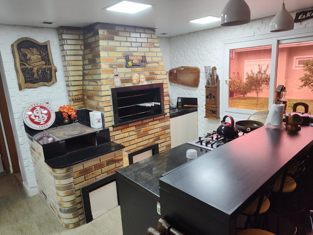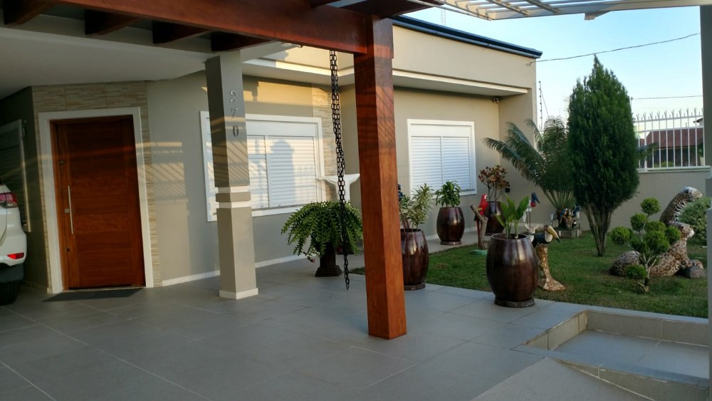 Casa de 3 dormitórios, sendo uma suíte, de 244m², com living dois ambientes, lareira, cozinha conceito aberto, banheiro social, salão de festas e espaço gourmet, churrasqueira, banheiro auxiliar, lavanderia, escritório, passagem lateral, pátio e garagem para até 4 carros.