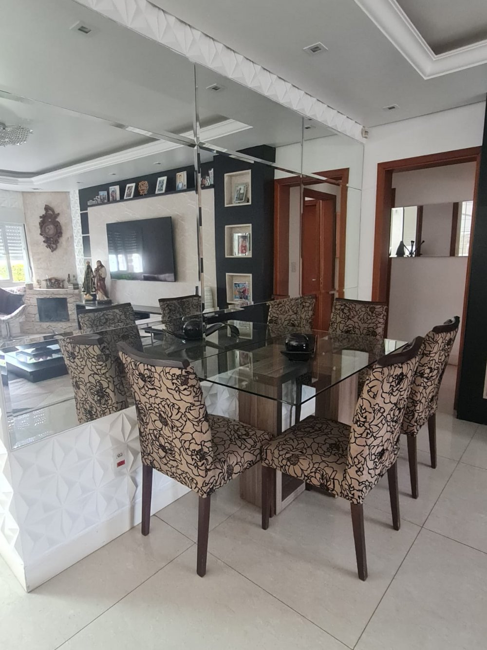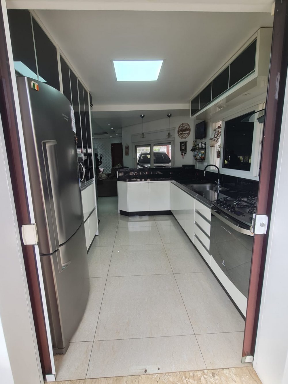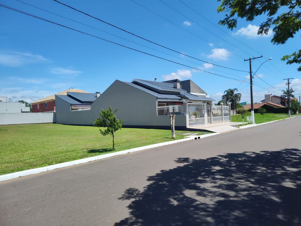 Casa de 3 dormitórios, sendo uma suíte, de 244m², com living dois ambientes, lareira, cozinha conceito aberto, banheiro social, salão de festas e espaço gourmet, churrasqueira, banheiro auxiliar, lavanderia, escritório, passagem lateral, pátio e garagem para até 4 carros.