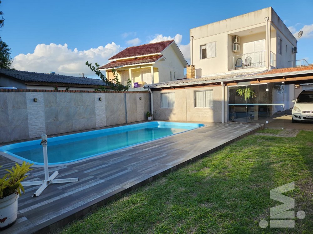 Sobrado 4 dormitorios, sendo 1 suite com closet e sacada, 197m², construída em 2014 com sala e cozinha integradas, despensa, área gourmet, pátio com piscina, 1 dos dormitorios fica no terreo, no fundo tem uma obra inacabada de170metros quadrados com 4 apartamentos de 40m2 cada. Cada apartamento tem 2 quartos, 01 banheiro, sala e cozinha integrados. Está na fase de reboco. Já foram comprados os canos hidráulicos, 4 relógios individuais para leitura de luz.